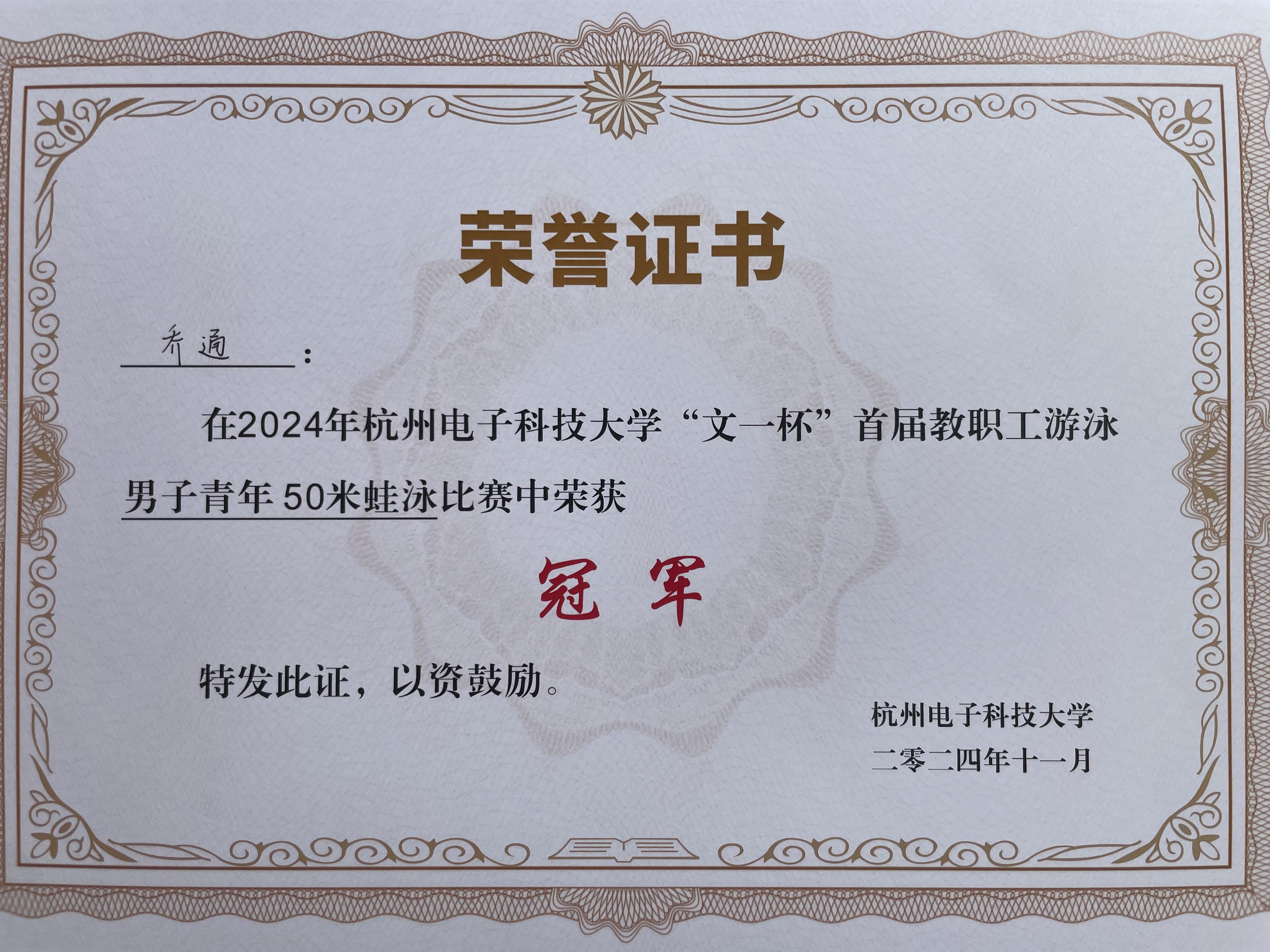 2024年 杭州电子科技大学“文一杯”首届教职工游泳男子青年50米蛙泳比赛冠军[证书]